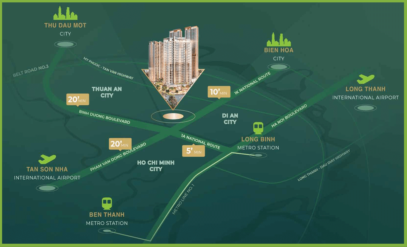 - Nằm ngay quốc lộ 1K chỉ mất 30 phút để di chuyển về Trung tâm quận 1 và 20 phút tới sân bay quốc tế Tân Sơn Nhất.