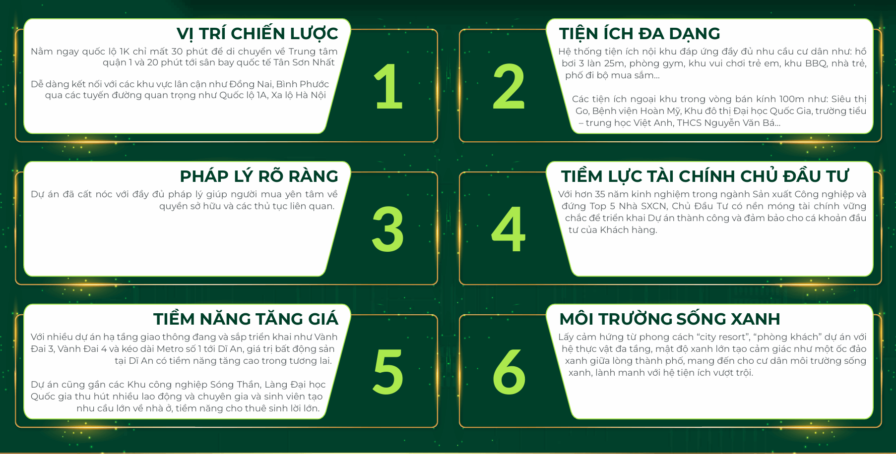 - Dự án cũng gần các Khu công nghiệp Sóng Thần, Làng Đại học Quốc gia thu hút nhiều lao động và chuyên gia và sinh viên tạo nhu cầu lớn về nhà ở, tiềm năng cho thuê sinh lời lớn.